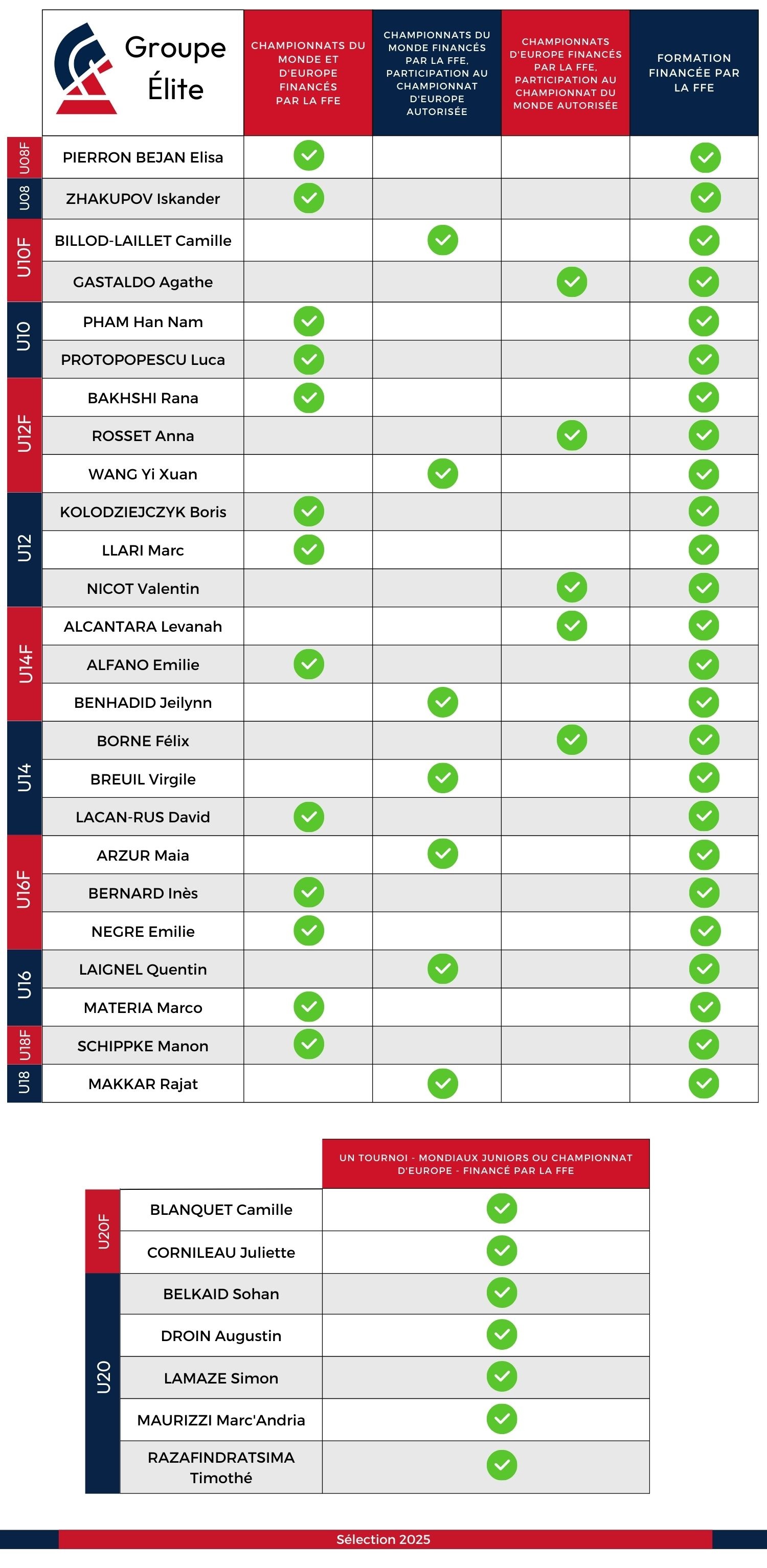 Sélection des U20 et U20F : le Championnat du monde junior s'est déroulé en février à Petrovac (Monténégro). Les deux champions de France U20 qui ne l'ont pas disputé pourront donc participer à la place au championnat d'Europe Individuel.