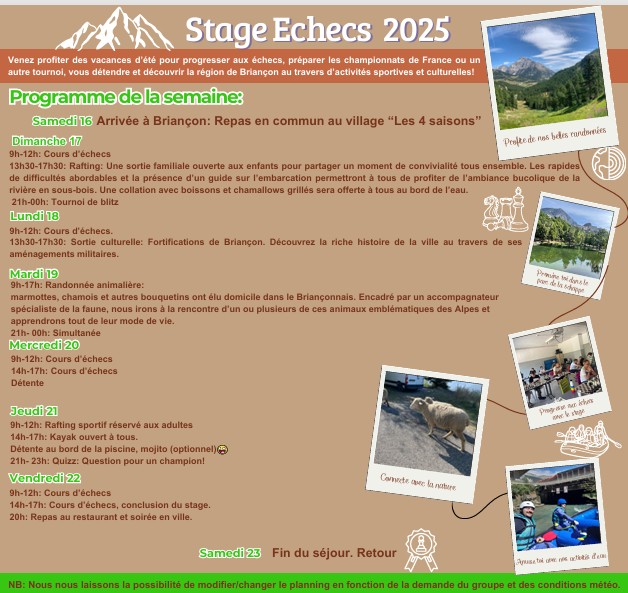 • 30 heures d'échecs, mais pas seulement : place aussi à l'aventure avec du rafting, du kayak et de superbes randonnées, le tout dans un cadre idyllique, au cœur des Alpes, loin des grosses chaleurs parisiennes !