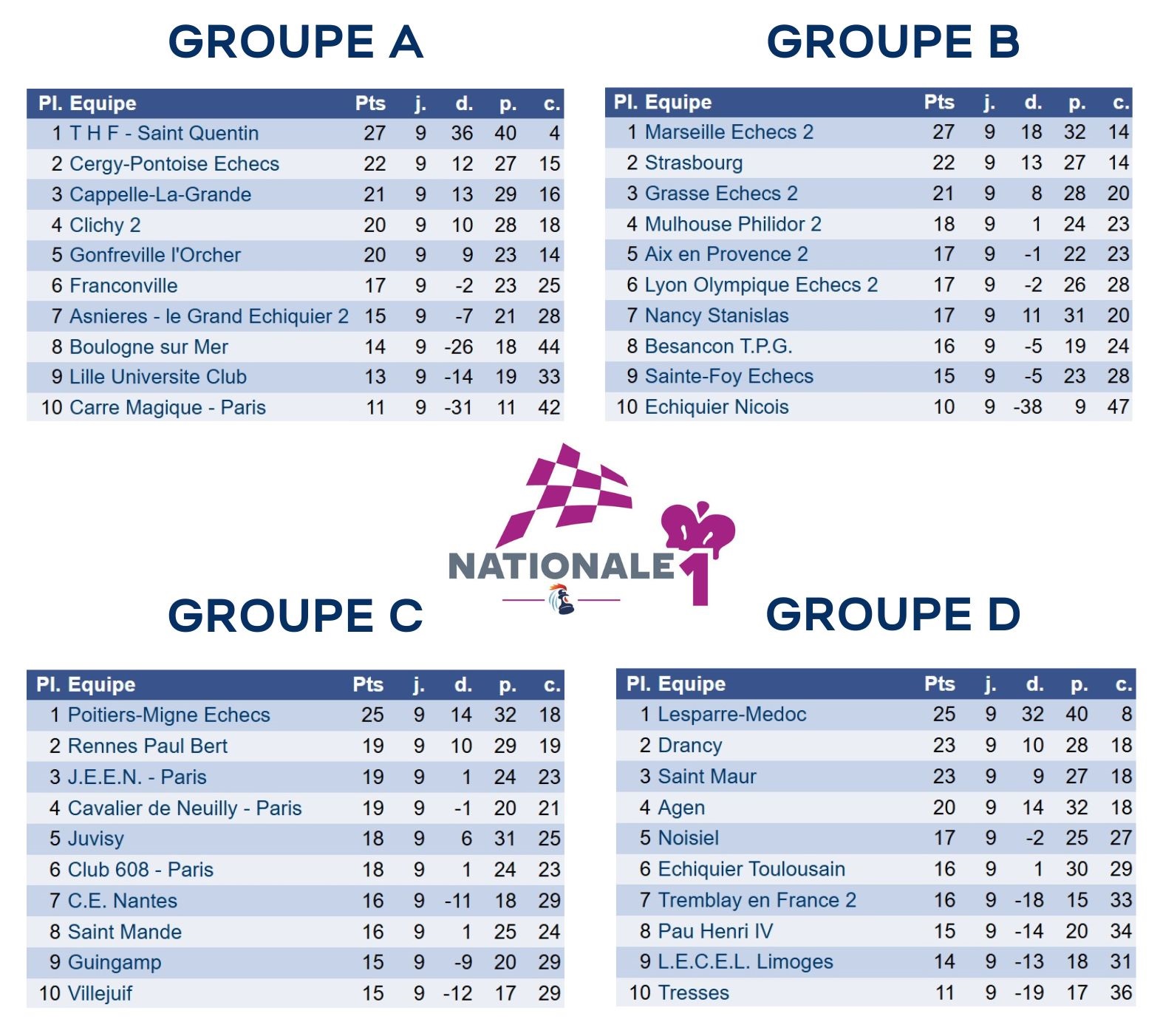 Groupe A : les Tours des Hauts de France de Saint-Quentin réalisent un sans-faute, avec sept victoires en sept matchs ! Avec 27 points, le club de l'Aisne devance nettement Cergy-Pontoise Echecs (22 points) et Cappelle-La-Grande (21 points).