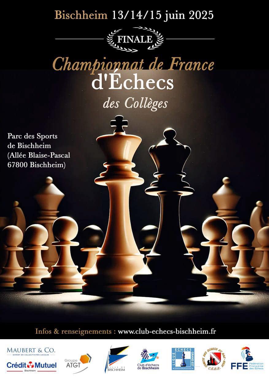 La Finale du Championnat de France des collèges était organisée par le Club d'Échecs de Bischheim du 13 au 15 juin 2025 à Bischheim (Bas-Rhin). Cet événement était le point d'orgue d'une saison faste avec 4900 participants aux phases départementales des collèges. 24 équipes se sont affrontées pour remporter le titre national, et le collège Fleming d'Orsay soulève la coupe ! Les Franciliens ont remporté huit matchs sur neuf, annulant seulement contre le Collège des Missions Africaines d'Haguenau (vainqueur du Challenge des Collèges UNSS en 2025). Après avoir terminé troisième en 2023, le College Fleming d'Orsay monte cette année sur la plus haute marche du podium : bravo à Aurélie Boussuge, Justin Chaumont-Messe, Nguyen-Khoi Nguyen, Maria Tymchenko, Raphael Dutfoy, Thomas Boussuge, Martin Viala Merlot, Marc Sanchez, Tristan Boitel et Ellora Windels !