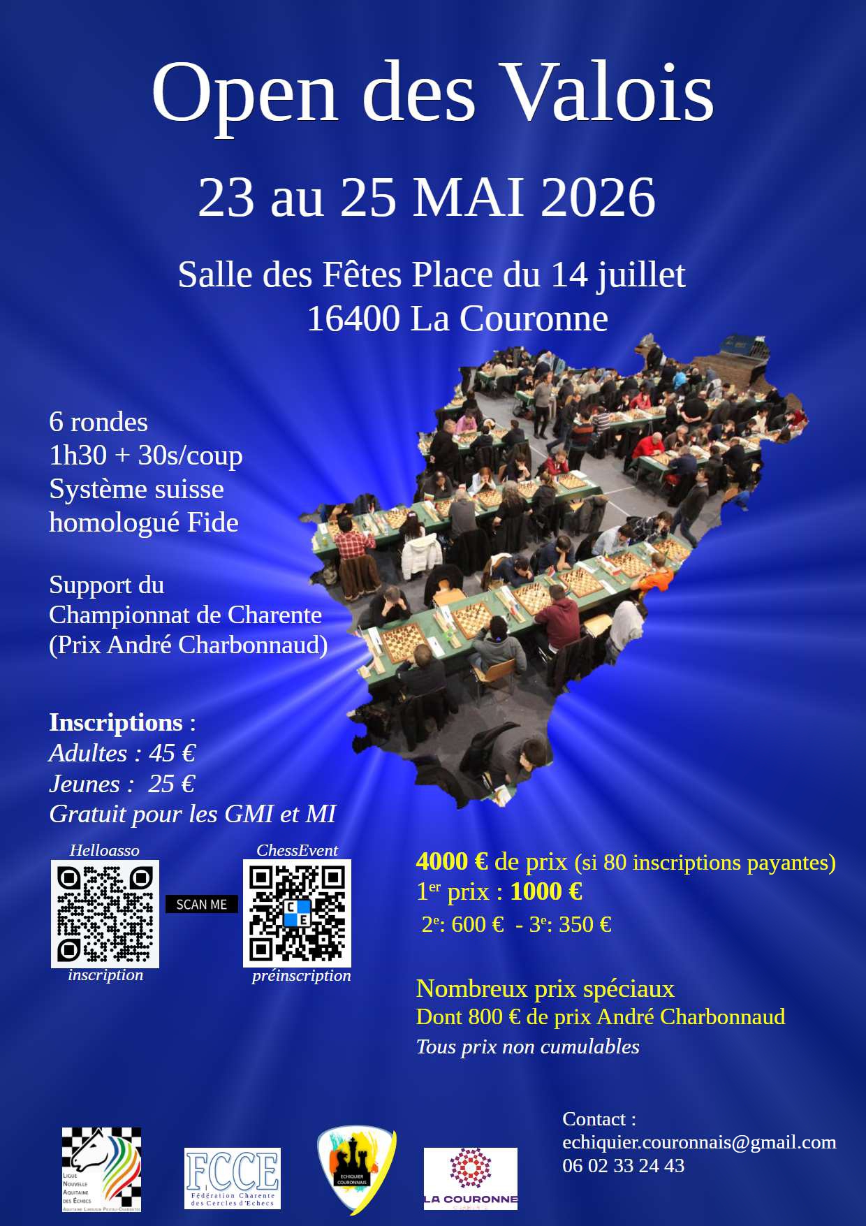 L'Échiquier Couronnais organise son 3e Open FIDE des Valois, tournoi en 6 rondes sur 3 jours, ouvert à tous les Elo avec prix par catégories.