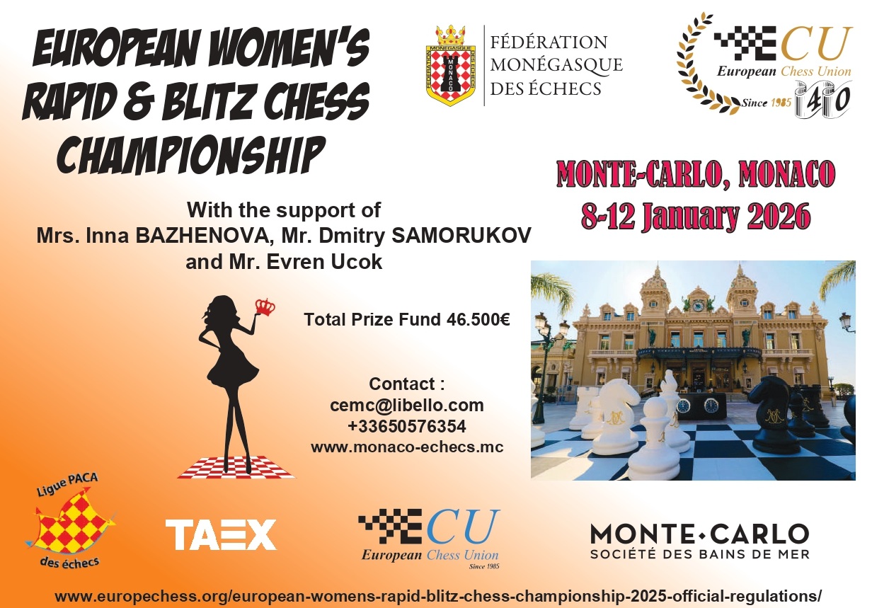Les Championnats d'Europe féminins individuels rapides et blitz, organisés par la Fédération monégasque des Échecs, se dérouleront à Monaco du 9 au 11 janvier 2026. Ils débuteront par le tournoi de blitz vendredi 9 janvier, disputé en 13 rondes à la cadence de 3 minutes + 2 secondes par coup. Il sera suivi par le Championnat de parties rapides les 10 et 11 janvier, joué en 11 rondes à la cadence de 15 minutes + 10 secondes par coup. 25 joueuses françaises ont déjà annoncé leur participation, dont Deimante Daulyte-Cornette, championne de France 2024, Mitra Hejazipour, championne de France 2023, ainsi que Pauline Guichard et Nino Maisuradze, doubles championnes de France.