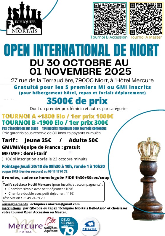 Inscription par QRcode (voir affiche) ou sur HelloAsso : Echiquier Niortais HelloAsso