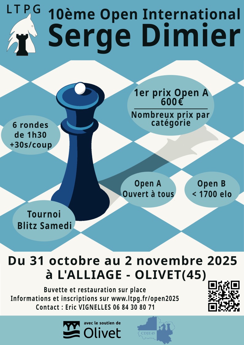 Le club "La Tour, Prends Garde !" d'Olivet, organise son 10ème Open International Serge Dimier du 31 octobre au 2 novembre 2025 à la salle de l'Alliage, 1 rue Michel Roques, 45160 OLIVET (banlieue sud d'Orléans).