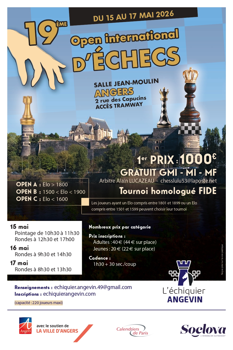 Le dix-neuvième Open International d'échecs, organisé par l'Echiquier Angevin se tiendra du 15 au 17 mai 2026.