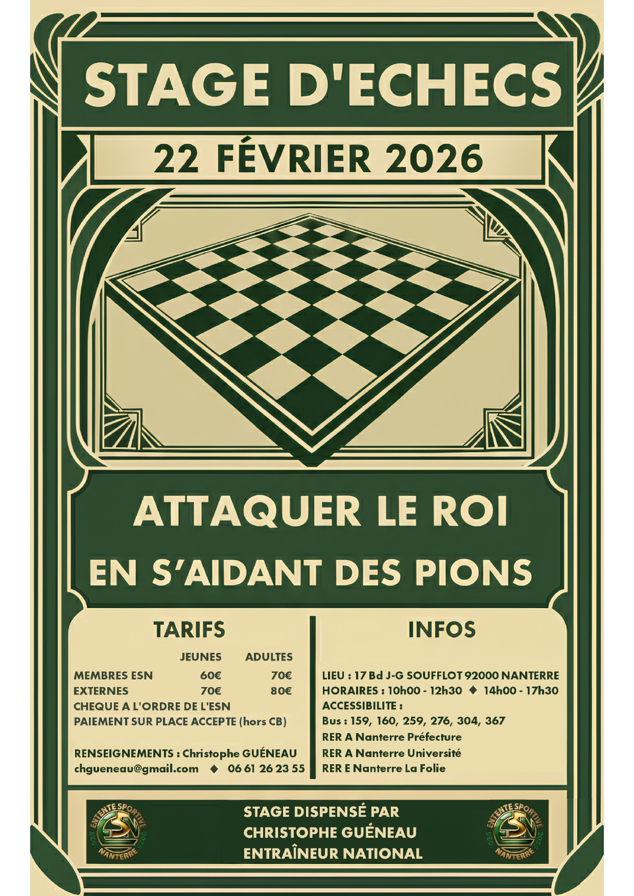 Christophe GUÉNEAU, Entraineur National de la FFE, et Animateur 3e degré (DAFFE3), animera un stage d'échecs le 22 février 2026 au sein de l'Entente Sportive Nanterre.