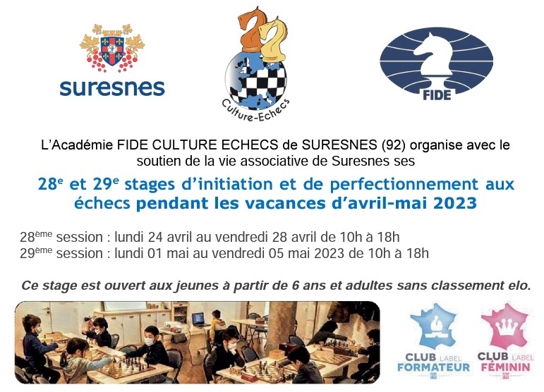 L'Académie FIDE CULTURE-ECHECS de SURESNES (92) organise le 28e et 29e stage d'initiation et perfectionnement aux échecs, du 24 au 28 avril 2023 et du 1er au 5 mai 2023.