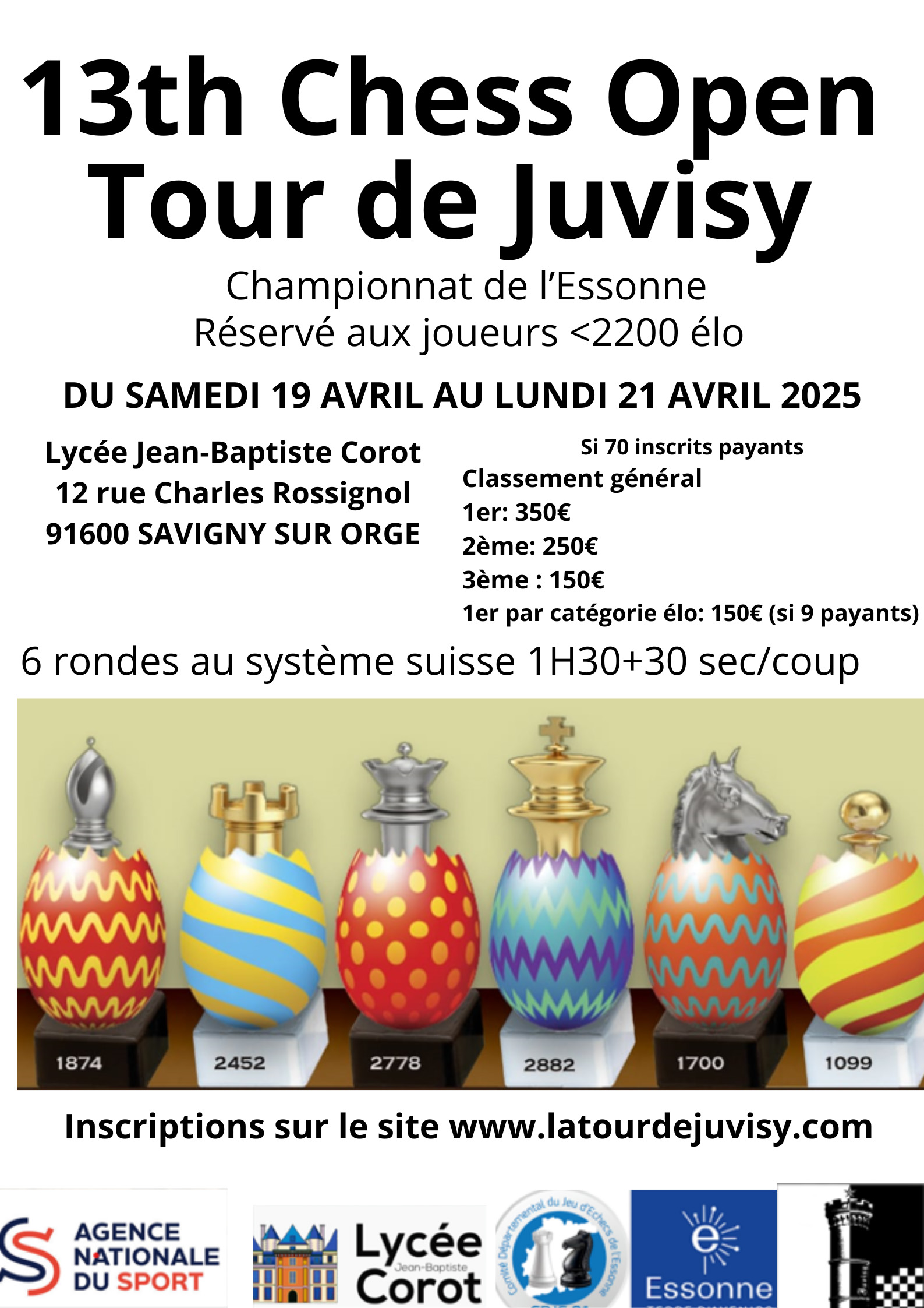 Open homologué FIDE, ouvert à tous (< 2400 Elo), 5 rondes (6 rondes si +40 joueurs), cadence 2×90 min (60'+30'').