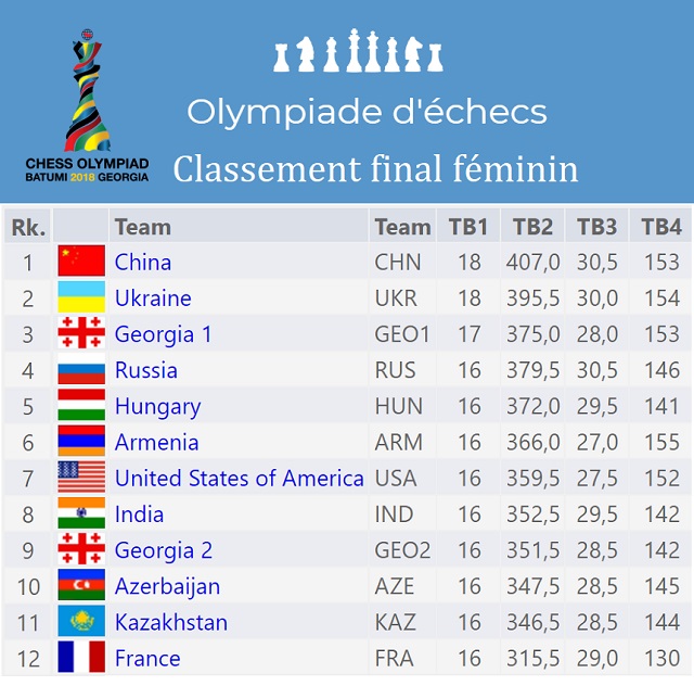 Clap de fin pour la 43e Olympiade d'échecs qui s'est déroulée à Batoumi (Géorgie). À l'issue des 11 rondes, les Bleus terminent 9e (6e ex æquo) après avoir joué les premiers rôles pendant toute la compétition, battant la Hongrie et l'Ukraine. L'équipe de France jouait pour une médaille lors de la dernière ronde, mais elle s'est inclinée face à la Russie sur le score de 1,5 à 2,5. Saluons la performance remarquable de Christian Bauer, qui décroche la médaille de bronze au cinquième échiquier : avec 7 points sur 9 et une performance à 2743, Christian a joué un rôle très important au sein de l'équipe de France.