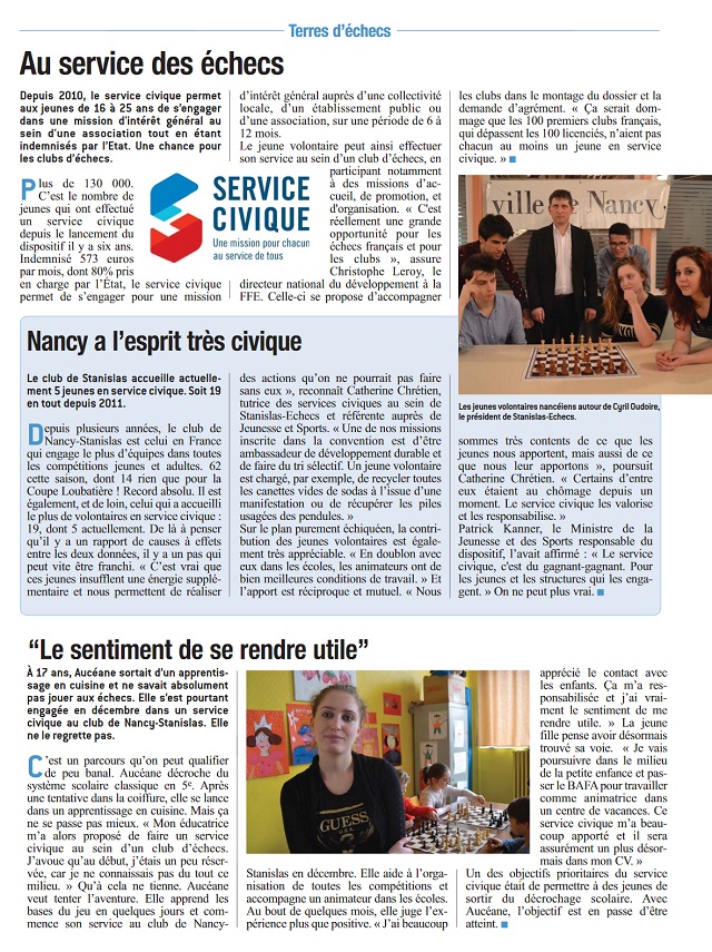 •    Vous cherchez un service civique ? Vous pouvez diffuser votre annonce sur le site fédéral : http://www.echecs.asso.fr/Default.aspx?Cat=24