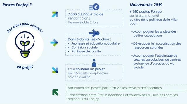 Les postes Fonjep sont des aides de 7 000 € à 8 000 € versées par l'intermédiaire du Fonjep pour le compte de l'État à des associations loi 1901 de jeunesse et d'éducation populaire. Ces aides viennent soutenir un projet qui nécessite l'emploi d'un salarié qualifié, et sont attribuées pour 3 ans renouvelables deux fois.