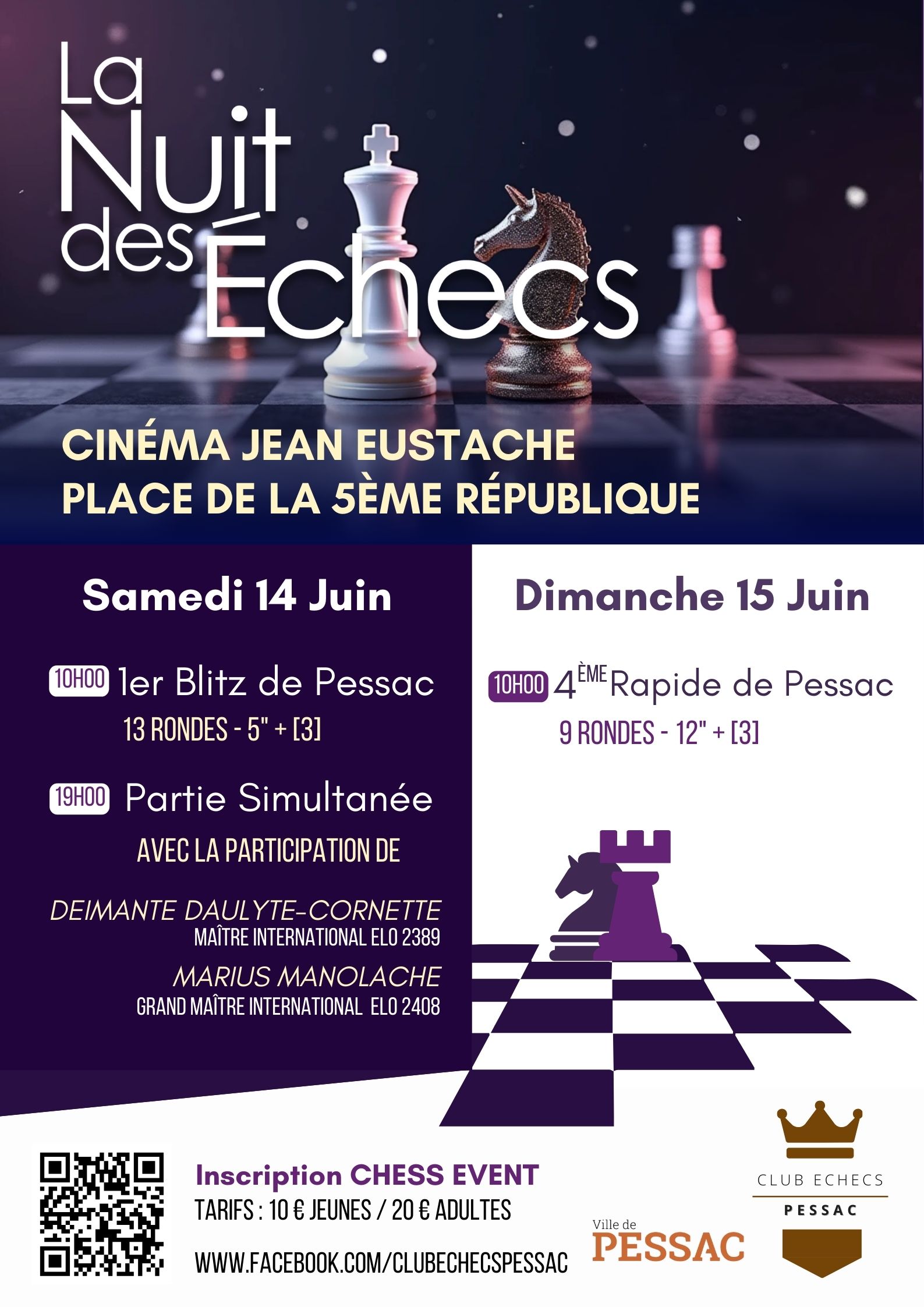 SAVE THE DATE ! La Nuit des Échecs, organisée par le Club Echecs de Pessac, se tiendra au Cinéma Jean Eustache le samedi 14 et le dimanche 15 juin. Cette 4e édition de la Nuit des Échecs est marquée par la présence exceptionnelle de deux grands maîtres : Marius MANOLACHE (Elo 2408), grand maître international d'échecs et entraineur du Sah Club Galati en Roumanie et Deimanté DAULYTE-CORNETTE (Elo 2389), grand maître international féminin et maître international, également quintuple championne de Lituanie et championne de France d'échecs à l'Alpe d'Huez (Isère) en 2024. Elle est la 3e joueuse française derrière Marie Sebag et Almira Skripchenko.