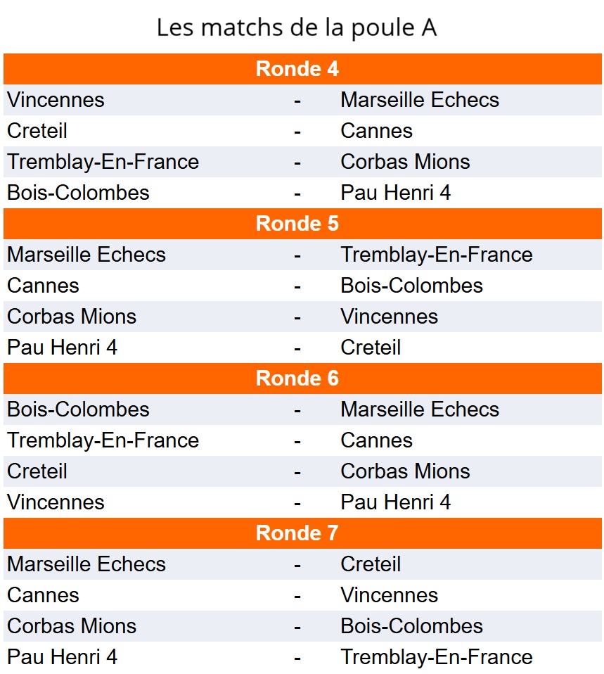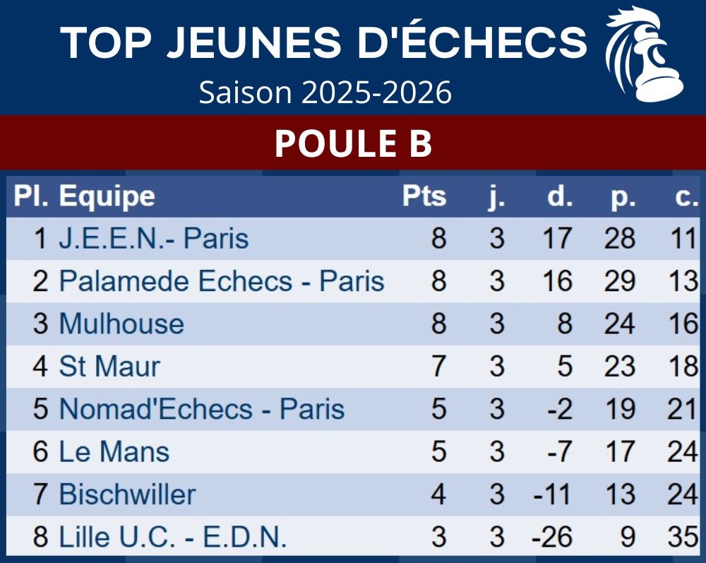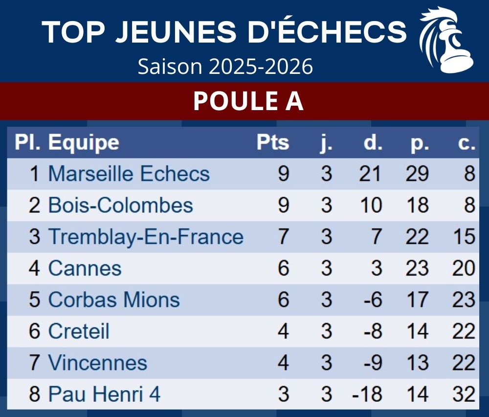 Dans la poule A, les équipes sont accueillies par le club de Vincennes. Après les trois premières rondes disputées en novembre, Marseille Échecs et Bois-Colombes se partagent la première place avec un score parfait de 9 points. Tremblay-en-France n'est pas loin derrière, avec sept points. Cannes et Corbas Mions sont bien placés pour obtenir une place en poule haute, mais il reste quatre matchs : Créteil, Vincennes et Pau Henri 4 peuvent encore espérer se qualifier !Les matchs de la poule B, organisés par le tenant du titre le J.E.E.N., sont disputés dans la mairie du XVe arrondissement de Paris. Trois équipes dominent ce groupe : le J.E.E.N., Palamede Echecs - Paris et Mulhouse. Un petit point derrière ce trio, nous retrouvons Saint-Maur, suivi de Nomad'Echecs - Paris et Le Mans avec cinq points. Bischwiller (quatre points) et Lille U.C. - E.D.N. (trois points) ferment la marche, mais tout reste possible à l'issue de ces quatre matchs qui pourraient bouleverser le classement.