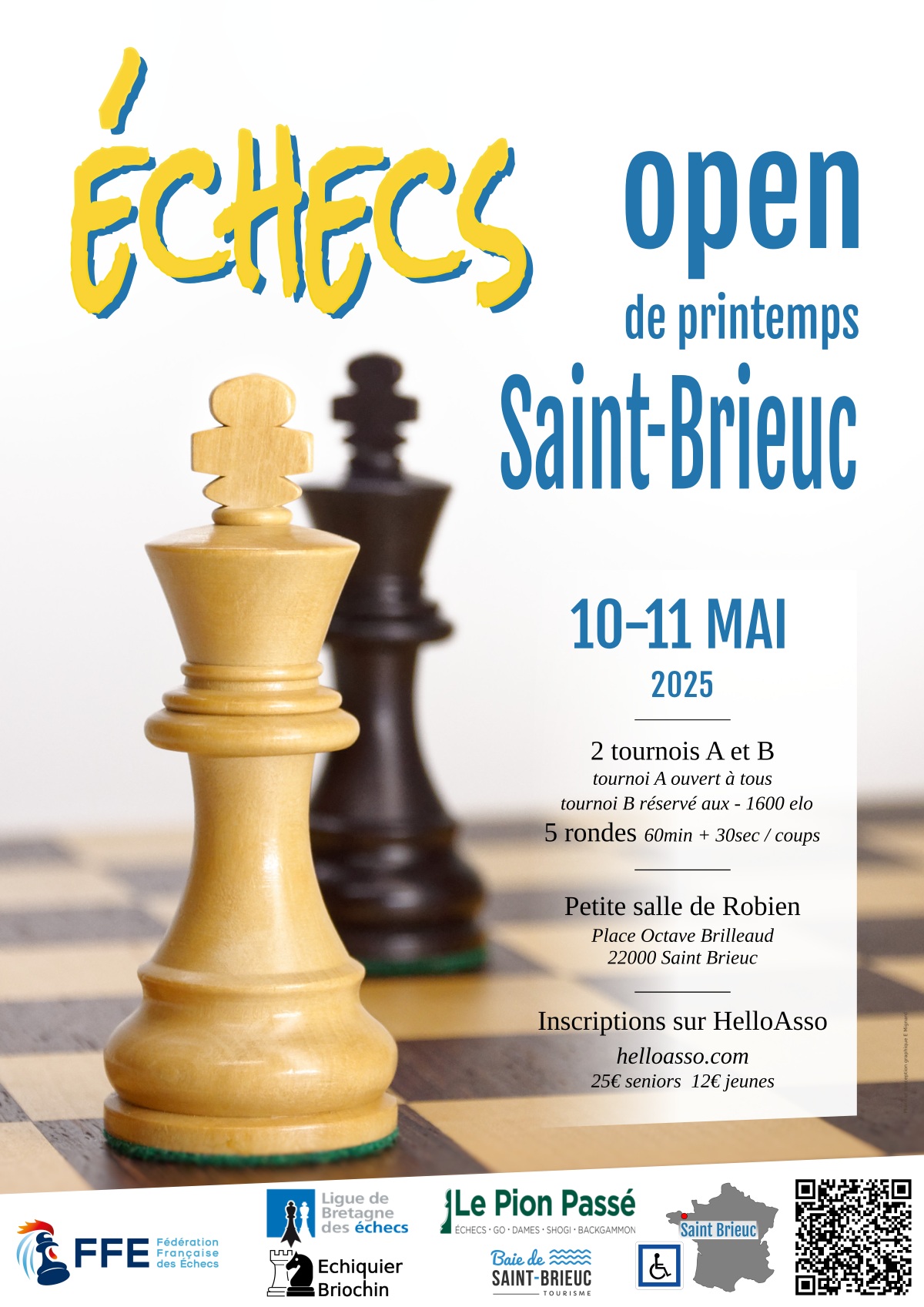 L'Échiquier Briochin est ravi de vous convier à son Open de printemps : un tournoi homologué Elo FIDE en cinq rondes de 60 minutes + 30 secondes. Il se tiendra les 10 et 11 mai à Saint-Brieuc, Petite salle de Robien place Octave Brilleaud.