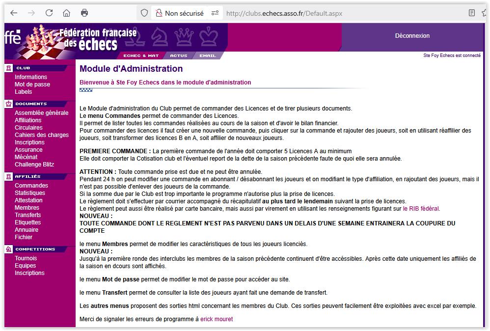 Il est important pour rester un club affilié de la FFE que la zone « Informations » de votre club soit à jour (Président, Adresse, etc.).