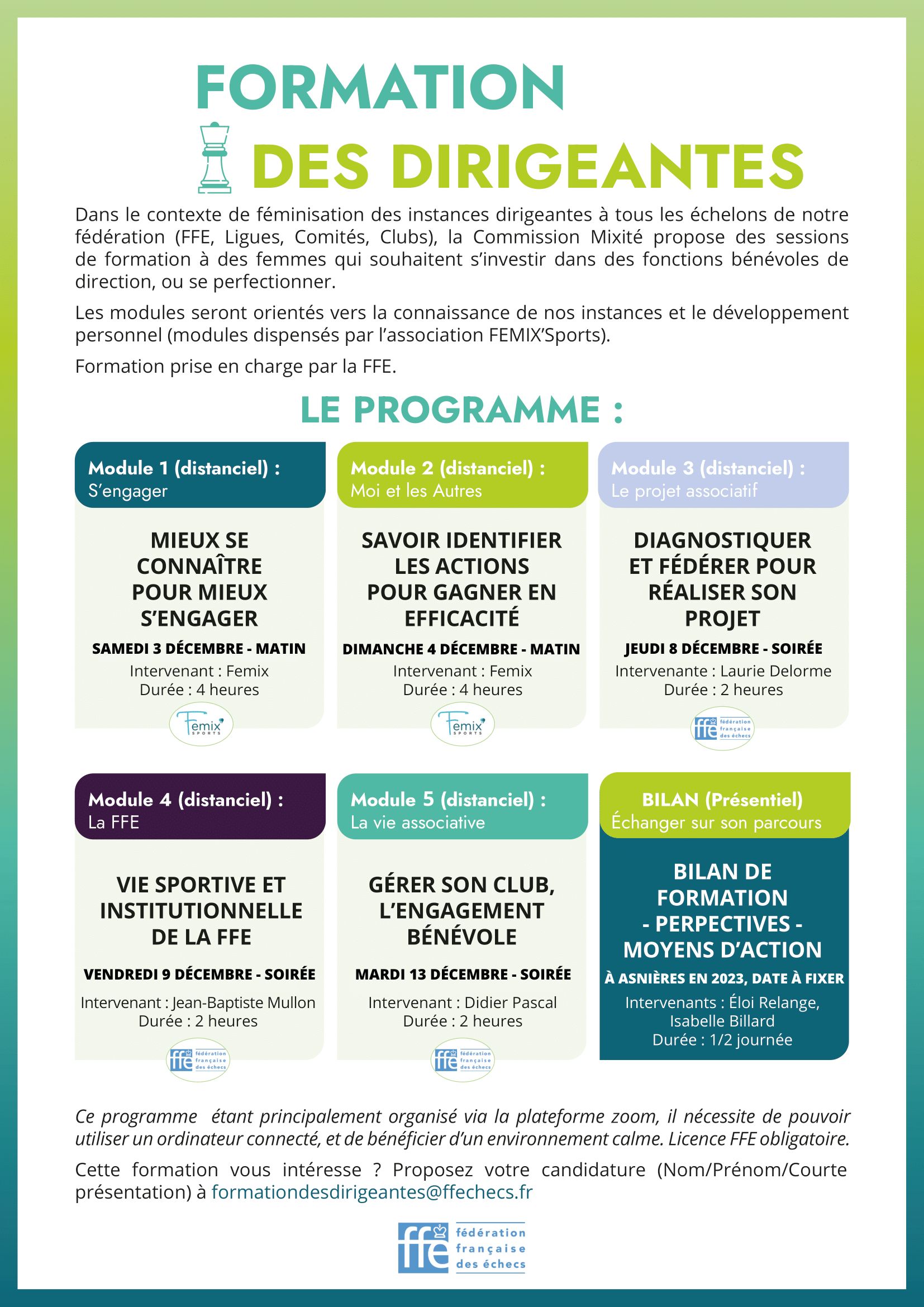 Cette formation vous intéresse ? Proposez votre candidature (Nom/Prénom/Courte présentation) avant le 15 novembre 2022 à formationdesdirigeantes@ffechecs.fr