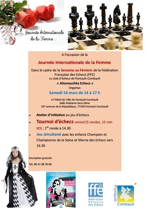 A l'occasion de la Journée Internationale des droits des femmes, dans le cadre de la Semaine au féminin 2019 de la Fédération Française des Echecs, le club d'échecs de Pontault-Combault "Alionouchka Echecs" organise :