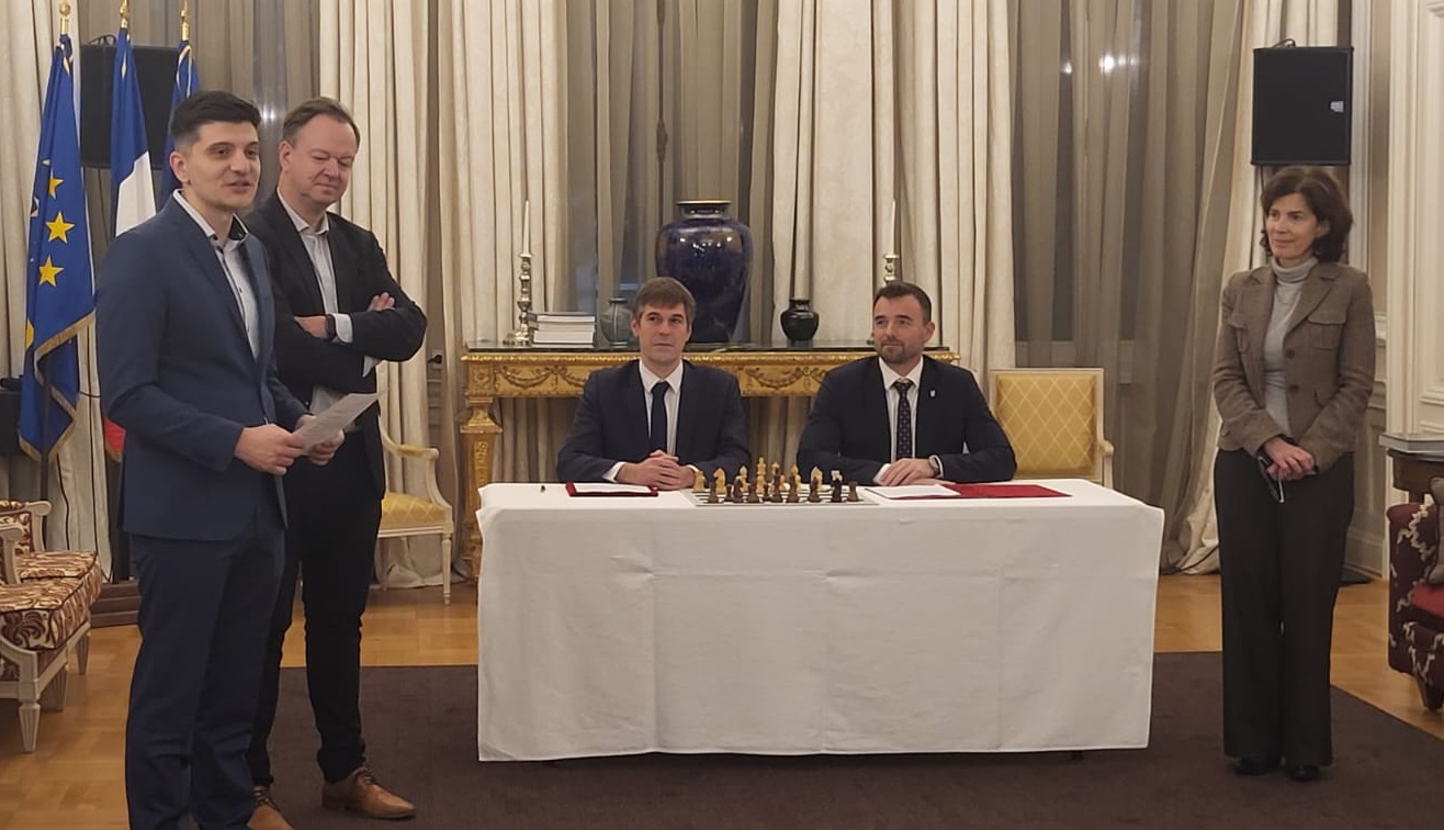 Éloi Relange, Président de la Fédération Française des Échecs et Vlad Ardeleanu, Président de la Fédération Roumaine des Echecs (FRSAH) ont signé le 7 décembre au sein de l'ambassade de France à Bucarest un protocole de coopération en présence de son Excellence Laurence Auer, Ambassadrice de France en Roumanie.