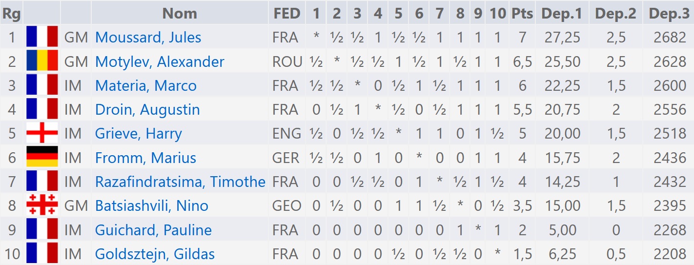 Le champion de France Jules Moussard s'impose avec un demi-point d'avance sur Alexander Motylev. À domicile, le joueur d'Asnières le Grand Échiquier a été très efficace, battant Nino Batsiashvili, Timothé Razafindratsima, Pauline Guichard, Gildas Goldsztejn et Augustin Droin. Invaincu, il gagne 10 points Elo ce qui lui permet d'espérer retrouver prochainement un classement supérieur à 2600.