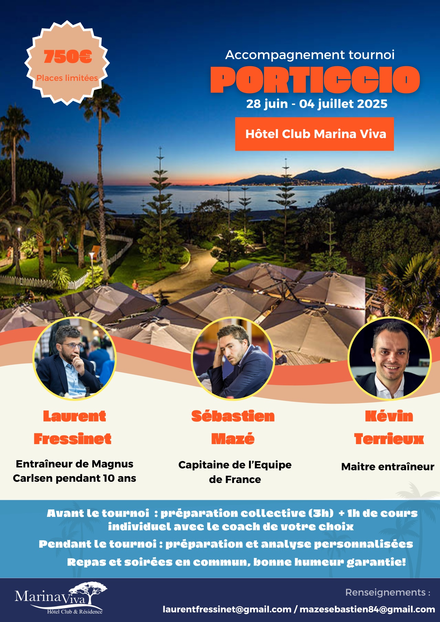 À l'occasion de l'Open International de Porticcio (28 juin au 5 juillet 2025), vivez une semaine unique aux côtés de trois grands noms des Échecs français :