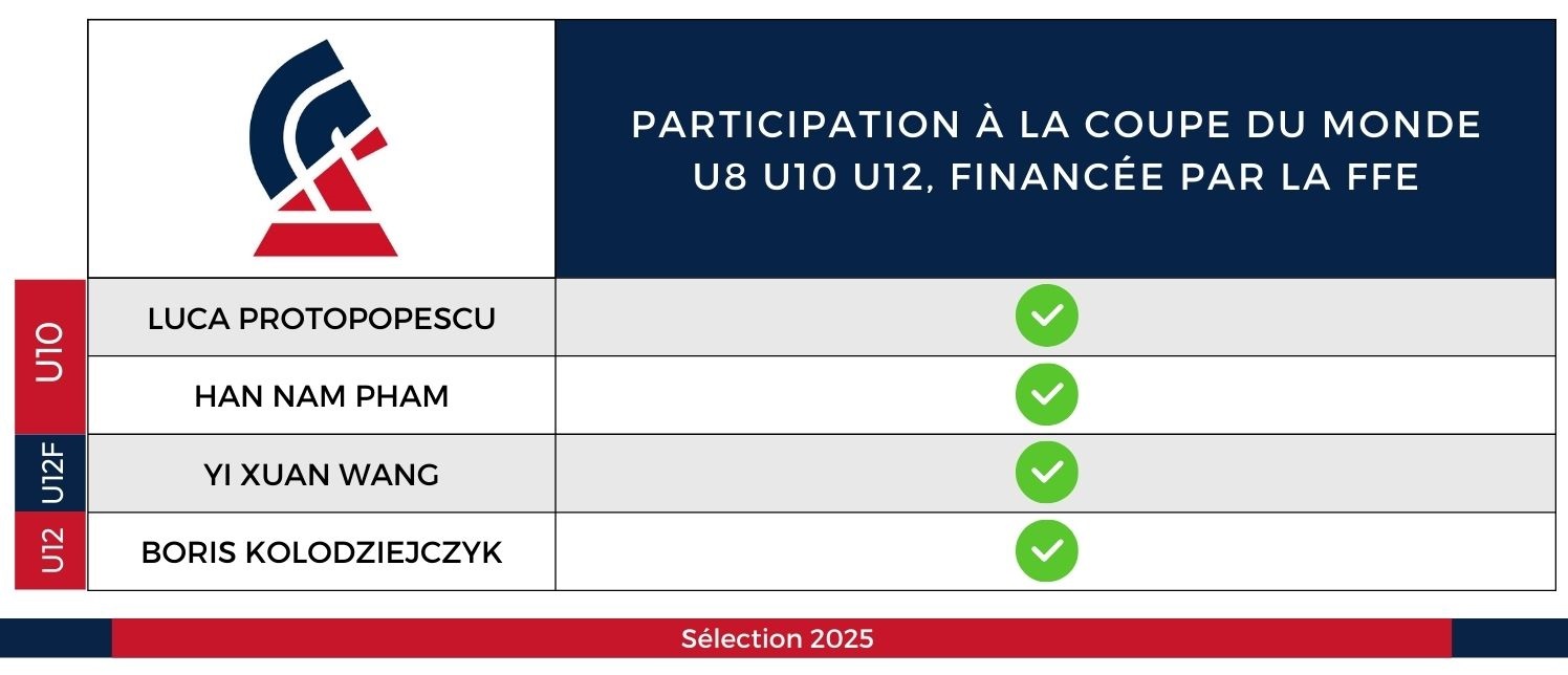 La Coupe du Monde a lieu du 22 juin au 2 juillet à Batumi (Géorgie). Du fait du calendrier serré, une sélection anticipée a été réalisée. La France aura 4 représentants, tous pris en charge par la FFE.