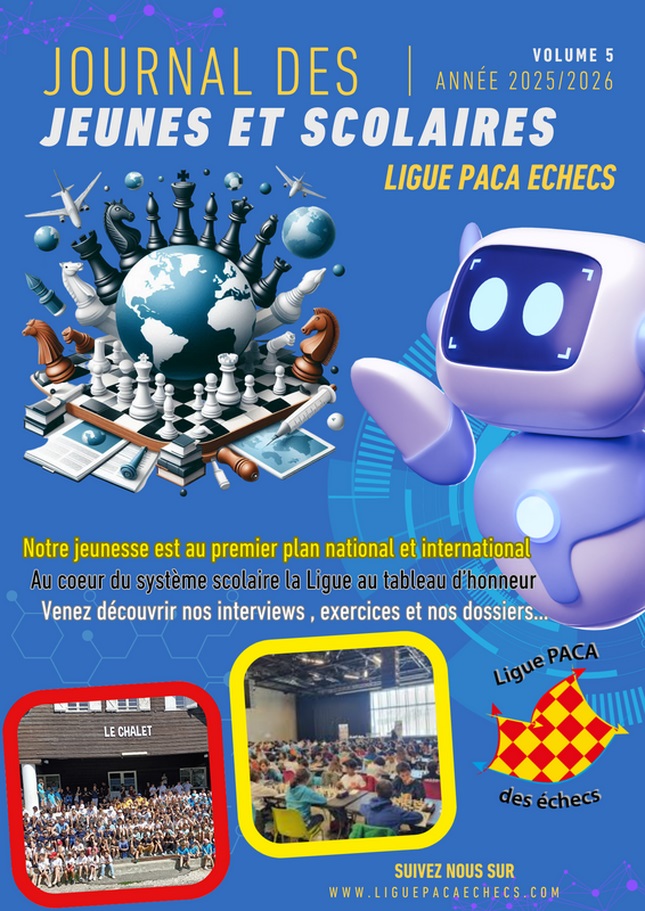 La Ligue PACA des Échecs vient de publier le 5e numéro de son magazine en ligne des jeunes et des scolaires. Il offre un coup de projecteur mérité sur celles et ceux qui participent au quotidien au développement des Échecs, en particulier auprès des enfants. Vous y découvrirez des portraits inspirants, des projets scolaires innovants et des témoignages qui prouvent combien le jeu d'échecs reste un formidable outil éducatif.