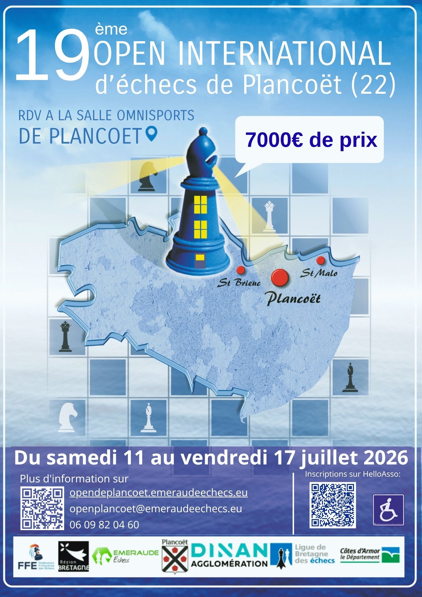 Plancoët organise son 19e Open International d'Echecs cet été. Le tournoi aura lieu du 11 au 17 juillet 2026.