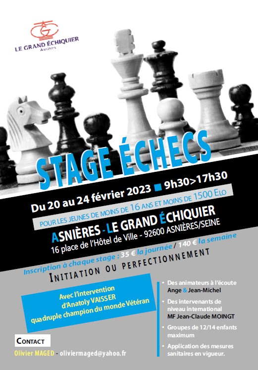 Le club d'Asnières-Le Grand Échiquier accueille dans ses locaux le maître international Vincent Colin, pour un stage d'échecs les 1 et 2 novembre . Les horaires sont de 9h30 à 12h et de 14h à 17h chaque jour, pour un niveau de moins de 2000 Elo.
