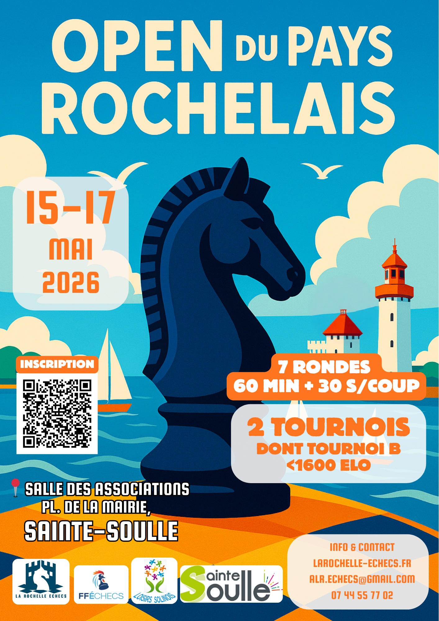Du 15 au 17 mai 2026, le club La Rochelle Echecs organise le 1er Open du Pays Rochelais, un nouveau rendez-vous échiquéen qui réunira joueuses et joueurs de tous niveaux à Sainte-Soulle, salle des associations, place de la Mairie (17220).