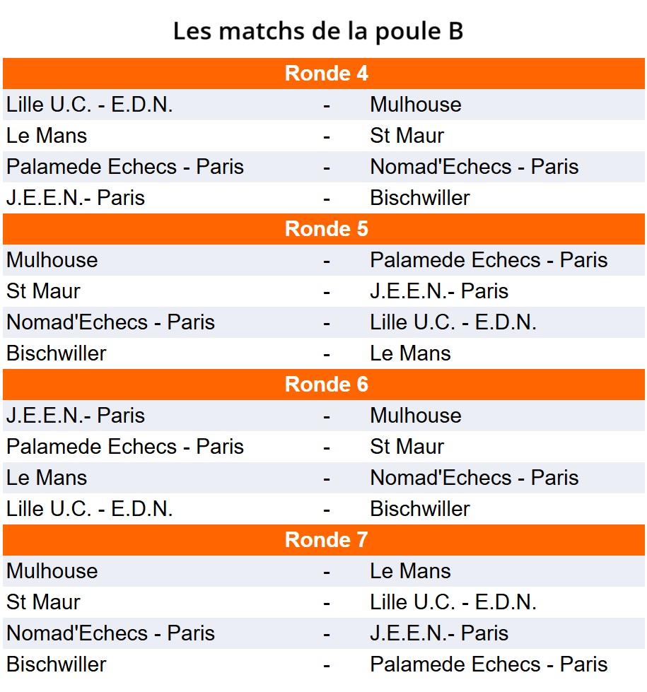 Dans la poule A, les équipes sont accueillies par le club de Vincennes. Après les trois premières rondes disputées en novembre, Marseille Échecs et Bois-Colombes se partagent la première place avec un score parfait de 9 points. Tremblay-en-France n'est pas loin derrière, avec sept points. Cannes et Corbas Mions sont bien placés pour obtenir une place en poule haute, mais il reste quatre matchs : Créteil, Vincennes et Pau Henri 4 peuvent encore espérer se qualifier !Les matchs de la poule B, organisés par le tenant du titre le J.E.E.N., sont disputés dans la mairie du XVe arrondissement de Paris. Trois équipes dominent ce groupe : le J.E.E.N., Palamede Echecs - Paris et Mulhouse. Un petit point derrière ce trio, nous retrouvons Saint-Maur, suivi de Nomad'Echecs - Paris et Le Mans avec cinq points. Bischwiller (quatre points) et Lille U.C. - E.D.N. (trois points) ferment la marche, mais tout reste possible à l'issue de ces quatre matchs qui pourraient bouleverser le classement.