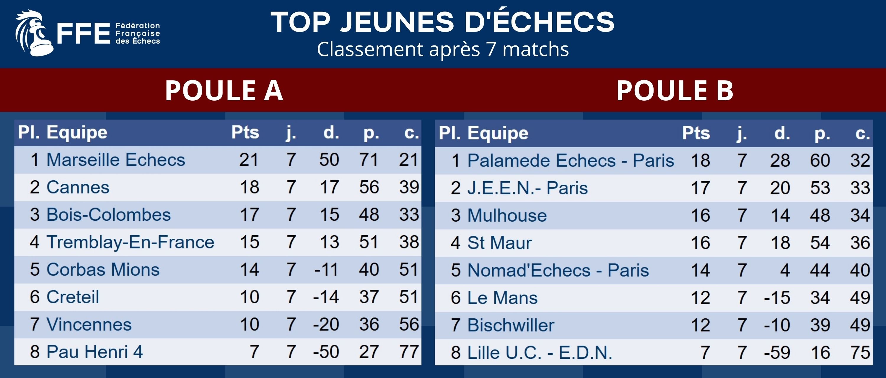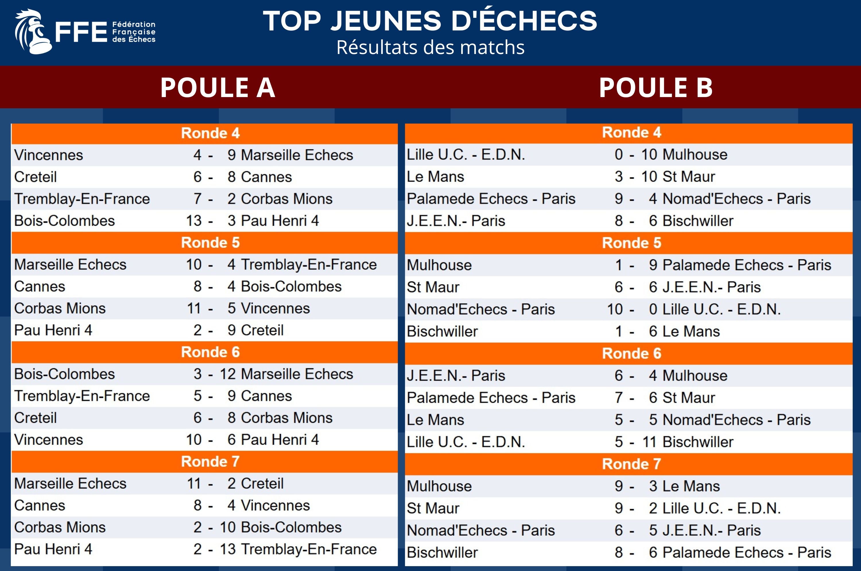 La deuxième phase du Top Jeunes s'est déroulée du vendredi 2 janvier au dimanche 4 janvier 2026. Marseille Echecs, Cannes, Bois-Colombes, Tremblay-en-France, Palamede Echecs, le J.E.E.N.- Paris, Mulhouse et Saint-Maur se qualifient pour la Poule Haute et sont donc en lice pour remporter le titre lors de la phase finale du 23 au 25 mai 2026 !