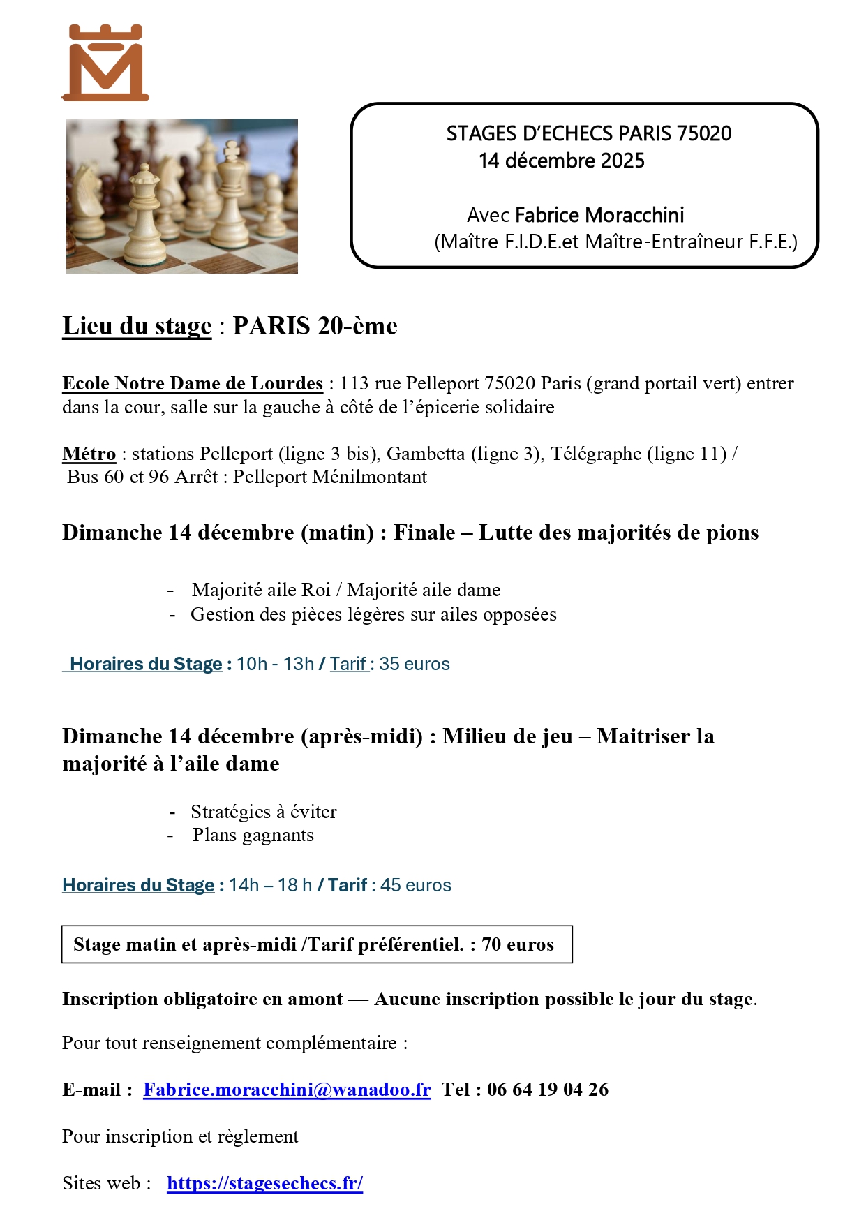 Fabrice Moracchini, Maître Fide et Maître Entraîneur, animera un stage à Paris le dimanche 14 décembre 2025.