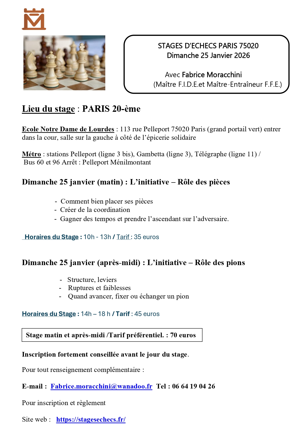 Fabrice Moracchini, Maître Fide et Maître Entraîneur, animera un stage à Paris le dimanche 25 janvier 2026.