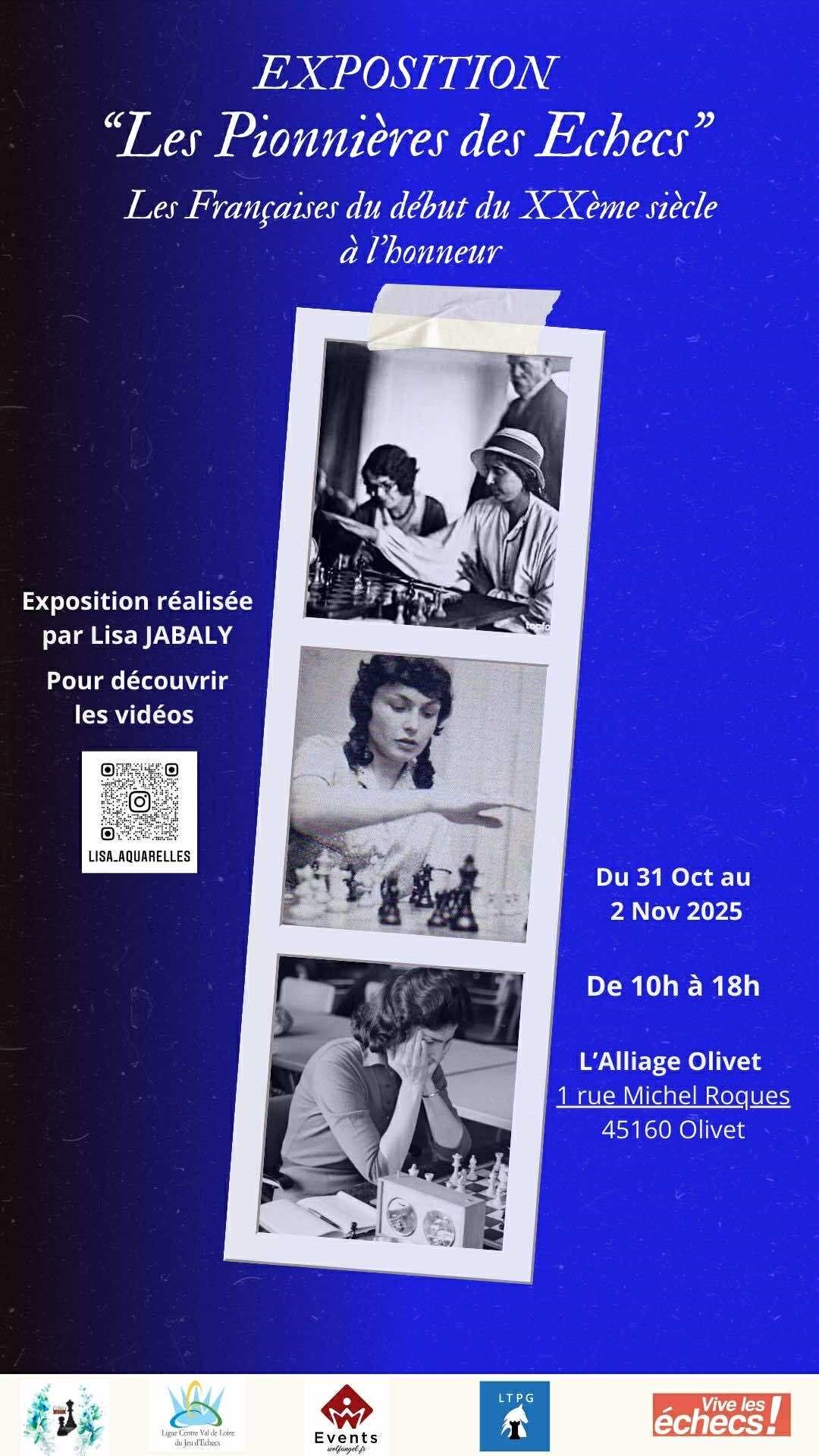 Lors du 10e Open International Serge Dimier, qui se tiendra à Olivet (Loiret 45) du 31 octobre au 2 novembre 2025, Lisa JABALY présentera les Pionnières de l'histoire du jeu d'échecs à travers une exposition inédite, mettant à l'honneur les Françaises du début du XXe siècle.