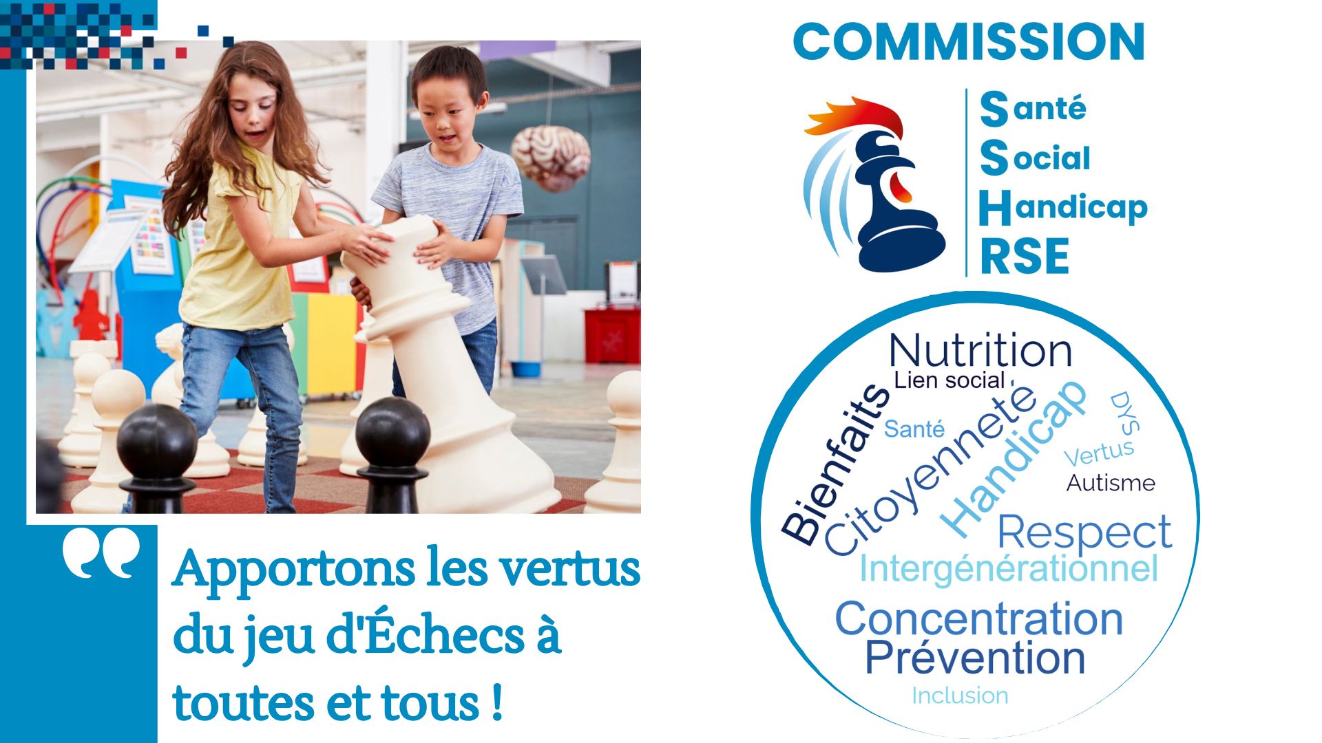 Cette stratégie offre de nombreuses idées pour le développement des Échecs, et s'intègre au plan de développement de la Commission Santé, Social, Handicap, RSE. La Commission propose donc sur son site toutes les ressources pour aider votre ligue, comité ou club à mener des actions dans de nombreux domaines :