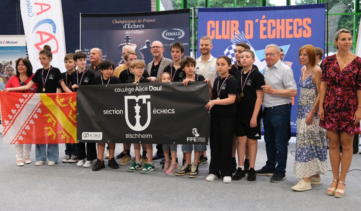 La Finale du Championnat de France des collèges était organisée par le Club d'Échecs de Bischheim du 13 au 15 juin 2025 à Bischheim (Bas-Rhin). Cet événement était le point d'orgue d'une saison faste avec 4900 participants aux phases départementales des collèges. 24 équipes se sont affrontées pour remporter le titre national, et le collège Fleming d'Orsay soulève la coupe ! Les Franciliens ont remporté huit matchs sur neuf, annulant seulement contre le Collège des Missions Africaines d'Haguenau (vainqueur du Challenge des Collèges UNSS en 2025). Après avoir terminé troisième en 2023, le College Fleming d'Orsay monte cette année sur la plus haute marche du podium : bravo à Aurélie Boussuge, Justin Chaumont-Messe, Nguyen-Khoi Nguyen, Maria Tymchenko, Raphael Dutfoy, Thomas Boussuge, Martin Viala Merlot, Marc Sanchez, Tristan Boitel et Ellora Windels !