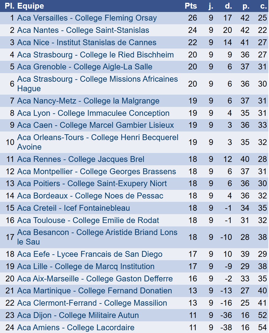 Le collège Saint-Stanislas de Nantes termine deuxième avec 24 points, et le collège Stanislas de Cannes monte sur la troisième marche du podium avec 22 points.