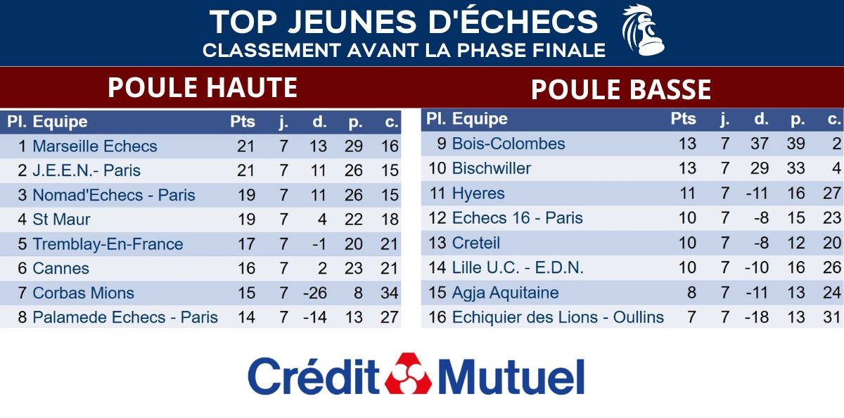 Le J.E.E.N. Paris, Saint-Maur, Tremblay-en-France, Palamede Echecs - Paris, Marseille Echecs, Nomad'Echecs - Paris, Cannes et Corbas Mions se sont qualifiés pour la Poule Haute et sont donc en lice pour remporter le titre. Tremblay-en-France est le double champion en titre après avoir remporté le trophée en 2023 et 2024.