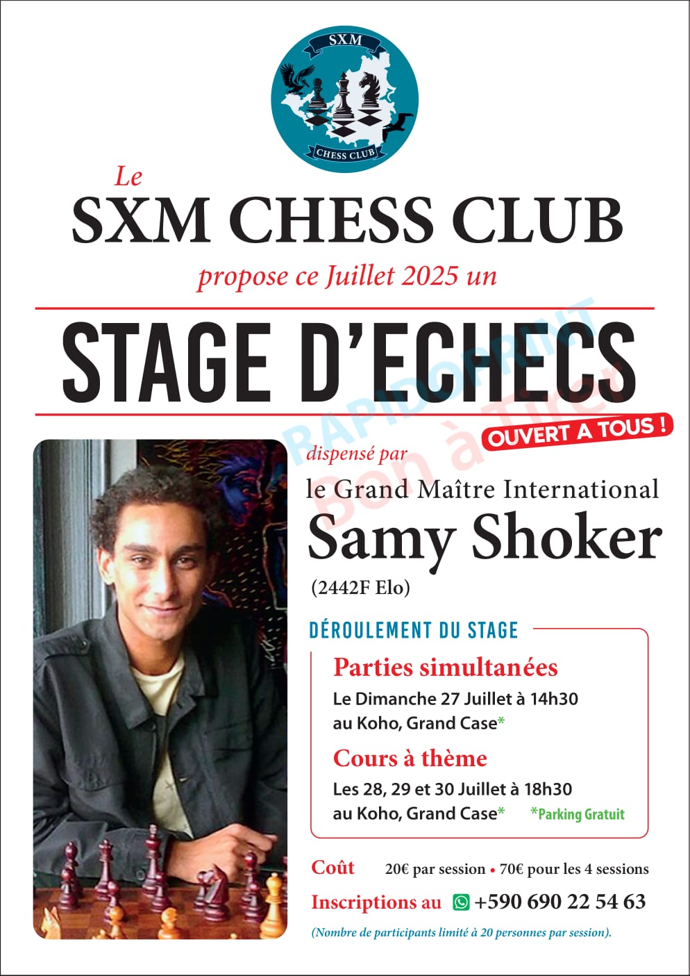 Le club d'échecs de la collectivité d'outremer de l'île de Saint-Martin, SXM Chess club organise un stage d'échecs animé par le Grand Maître International Samy SHOKER, qui se tiendra du 27 au 30 juillet 2025.