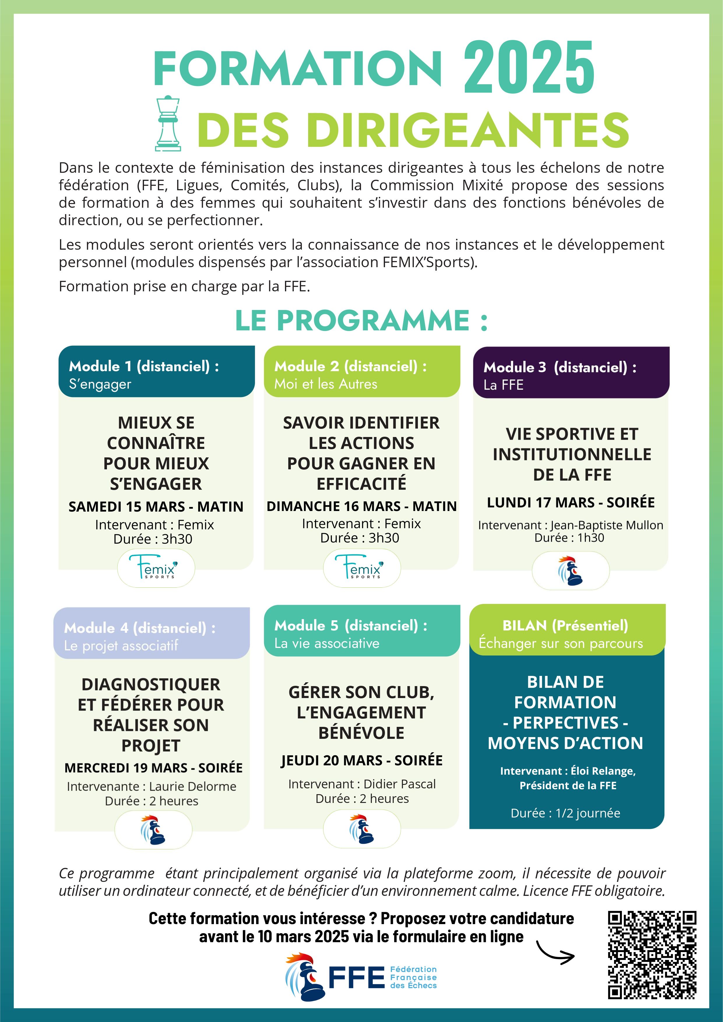 La Fédération Française des Échecs vous invite à rejoindre la quatrième promotion de formation des dirigeantes, qui débutera en mars 2025.