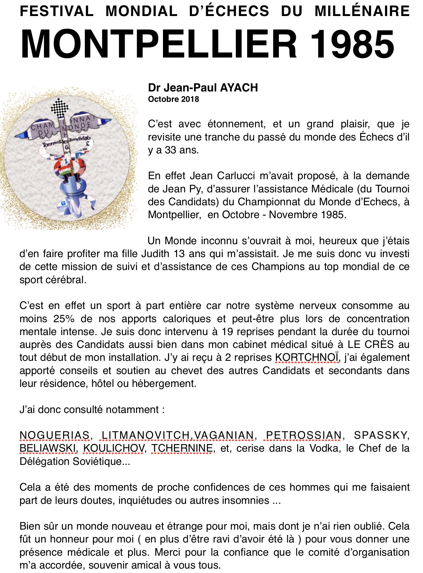 33 ans plus tard, voici le ressenti du Docteur Jean-Paul AYACH, assistant médical du Tournoi des candidats