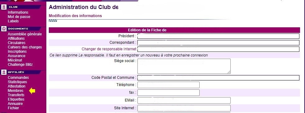 Le lien édite la fiche du club. Ensuite, les présidents de club peuvent renseigner, ou mettre à jour les informations dont l'adresse mail. Attention ! il n'est pas possible de modifier le nom du président. Si cette modification est nécessaire, il faut envoyer au siège fédéral le PV de l'AG qui a procédé à l'élection du président et/ou le récépissé de modification de la préfecture.