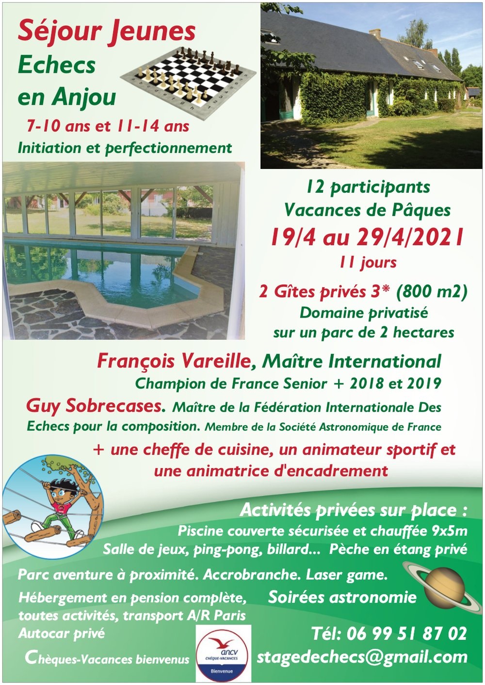 Hébergement en pension complète et transport A/R Paris en autocar privé, toutes activités échecs, sports, astronomie, etc.