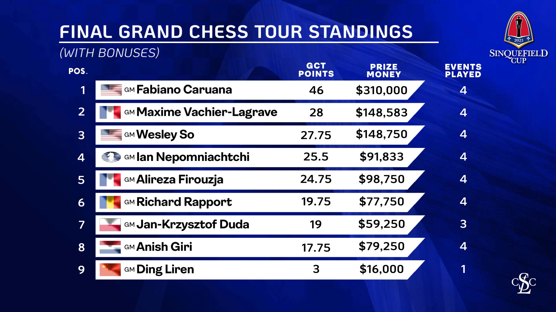 La 4e place de Maxime Vachier-Lagrave en Sinquefield Cup permet au Français d'occuper la 2e place du classement général 2023 du Grand Chess Tour.