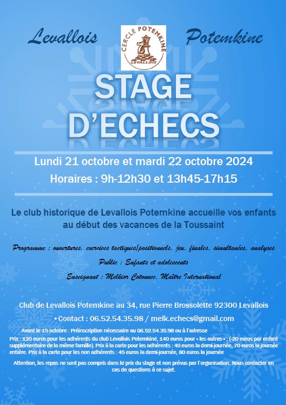 Le club de Levallois organise un stage d'échecs pour ces vacances de la Toussaint 2024 les lundi 21 et mardi 22 octobre 2024. A l'intention des jeunes, ce stage se tiendra au club de Levallois Potemkine (au 34, rue Pierre Brossolette 92300 Levallois - Salle Potemkine au deuxième étage).