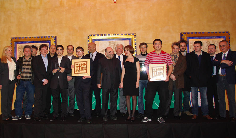 Au centre, Benno Feingold, pdg des Pyramides de Port-Marly, et Lara Parennin, partenaire de la manifestation, en compagnie du vainqueur, Maxime Vachier-Lagrave et du finaliste, Alexandr Fier, et entourés des lauréats du Grand Prix et des nombreux parrains de la manifestation.