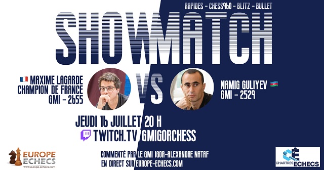Le C'Chartres Échecs et Europe-Echecs organisent un match entre les Grands-Maîtres Maxime Lagarde et Namig Guliyev le jeudi 16 juillet à partir de 20h00. 8 parties : 2 rapides, 2 Chess960, 2 blitz et 2 bullets, commentées par le GM Igor-Alexander Nataf sur sa chaîne Twitch https://www.twitch.tv/gmigorchess